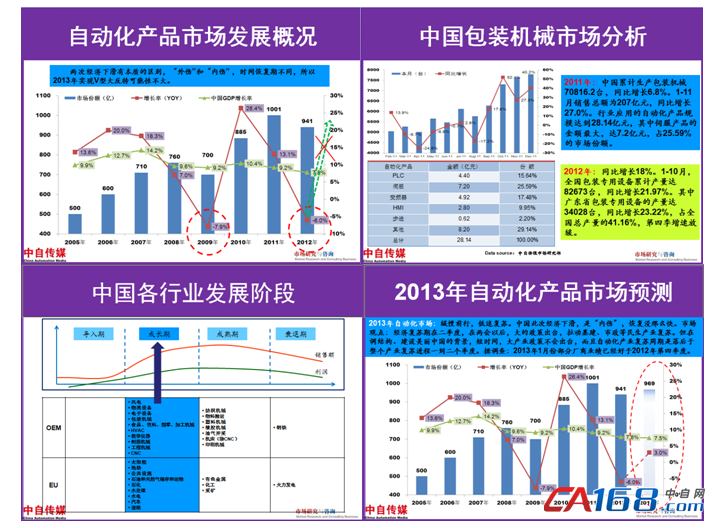 会议第一部分由赛远吴益宇先生分享2012年中国自动化市场总结和2013年展望。感谢中国数字移动传媒(简称:中自传媒)提供大量的数据和分析结论。2012年由于制造业投资紧缩、竞争性行业产能过剩、出口萎靡内需乏力等“内伤”造成整个自动化市场6%的下滑,中自传媒预测2013年实现V型大反转可能性不大,预测市场增长速度在3%左右。会议中详细分享了PLC、DCS、变频器、低压伺服、HMI、工控机、组态软件等产品在2012年的市场表现,同时详细分析了新能源汽车市场、电梯行业市场、包装机械行业市场、机器人市场的发展情况,并对2013年各自动化产品和自动化行业做出市场预测。对于国产品牌来说,无论是制造商或是渠道商,在未来都有广阔的发展空间,但同时也面临很大挑战。因此,必须通过转型升级,从长远考虑,才能做到可持续发展。