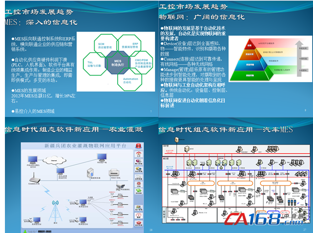 会议的第二部分由北京九思易自动化软件有限公司副总经理梁玲女士与在座嘉宾分享了组态软件发展趋势、易控组态软件的领先技术以及易控软件结合信息化的相关应用领域,以及2013年即将发布的新产品的特色功能。北京九思易自动化软件有限公司专注于组态软件研发、嵌入式软件应用、自动化信息化软件产品和系统解决方案服务。MES和物联网的应用为工业自动化在信息化领域带来了更广泛的应用,MES纵向联通控制系统和ERP系统,横向联通企业的供应链和营销系统,组态软件在MES系统中是一个重要的组成部分。物联网的产业链即所谓的DCM(Device、Connect、Manage)跟工业自动化的三层架构(设备层、控制层、信息层)互相呼应,在物联网的环境中,每一层次功能都是原来的传统功能的大幅进化。物联网的应用大大促进自动化朝着信息化目标前进。易控组态软件基于微软最新操作平台.NET开发,其良好的开放性和扩展性令其在MES和物联网等领域的发展大有作为。会上重点讲述了易控组态软件在智能农业灌溉、汽车MES、隧道交通、搅拌站、环保和节能等领域的应用。