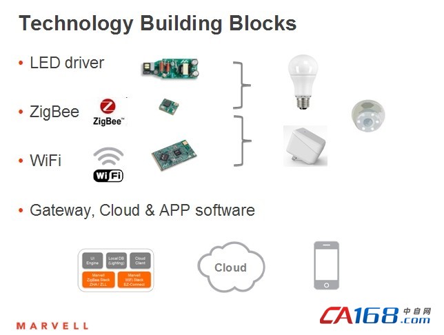 正如上述案例所示,基于Zigbee+WiFi的路线正是Marvell在智能照明中主推的解决方案,它具体包括四个层次的内容:首先,在LED驱动部分,得益于Marvell独特的数模混合架构,Marvell的智能LED照明解决方案采用了最少的芯片数量及器件数量,以满足球泡灯的小尺寸要求,且LED驱动拥有数字接口,可与通信芯片连接。其次,Marvell还提供整体的通讯网关方案,硬件基于Marvell的嵌入式WiFi、ZigBee等多种无线技术,从而最终实现多种无线制式包括ZigBee到WiFi和云端的无缝桥接。此外,Marvell提供的基于Kinoma技术的用户接口(UI)简单、美观、易用,支持多种操作系统包括IOS、Android等。而通过Marvell的软件合作伙伴,能够帮助用户实现云端软件和网关软件的支持,以实现LED照明控制的云管理。