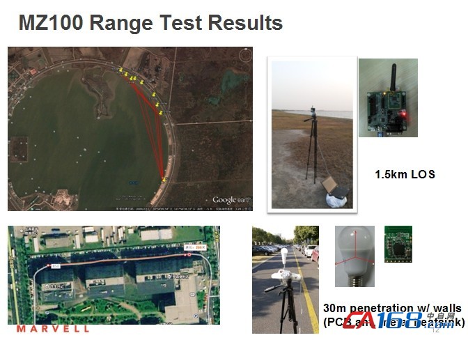 MZ100没有采用额外PA,采用PCB天线,并放置于LED金属灯壳内。上部分是在旷野测试,有效传输距离是1.5公里。下部分是室内测试,在中间有墙间隔的情况下能达到30米有效传输距离。很好的解决了卧室的灯泡信号传不到其它起居室的问题。