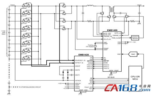 TI在隔离式DC-DC主动均衡技术的能源转换效率高达87%。像EM1410芯片组由5颗核心芯片加上5颗电源供应芯片所组成,其中最主要的EMB1432为十四信道AFE芯片、EMB1428为七信道闸控制器芯片,与EMB1499为七信道电压控制芯片等,来建构十四通道双向主动式电池芯均衡功能,串联14颗电池芯与最高60V工作电压,提供5V双向均衡电压与最大750V堆栈输出电压能力,并满足AECQ-100车用电子验证标准。